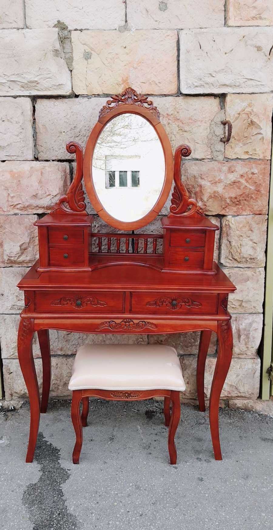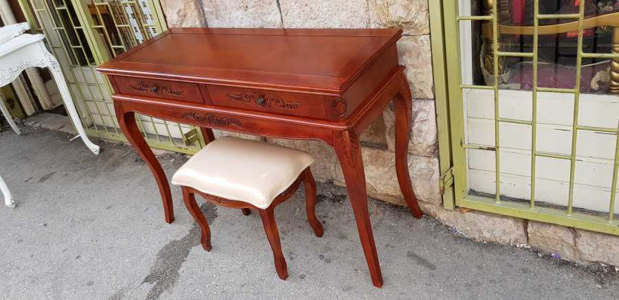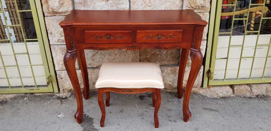 קונסולה איכותית מעץ מלא בשילוב גילופי עבודת יד ציוריים וכמובן שלוש מגירות לאיכסון מירבי והכל בגלריית ריהוט עתיק בירושלים