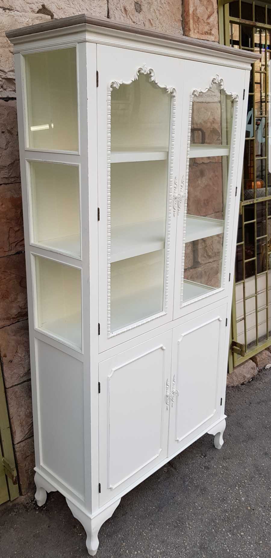 וויטרינה מעוצבת בגימור לבן עתיק בשילוב שתי דלתות ויטרינה ושתי דלתות תחתונות לאיכסון מירבי עם רגלי לואי