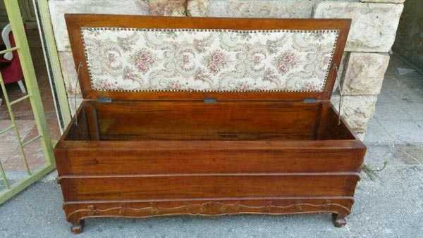מושב מהודר מעץ מהגוני בשילוב רגלי לואי וגילופים של עלי כותרת מסביב .מרופד בגימור קפיטונז גובלן בהיר הפלטה העליונה נפתחת לאיסחון מרבי משולב עם צירים להחזקת הדלת
